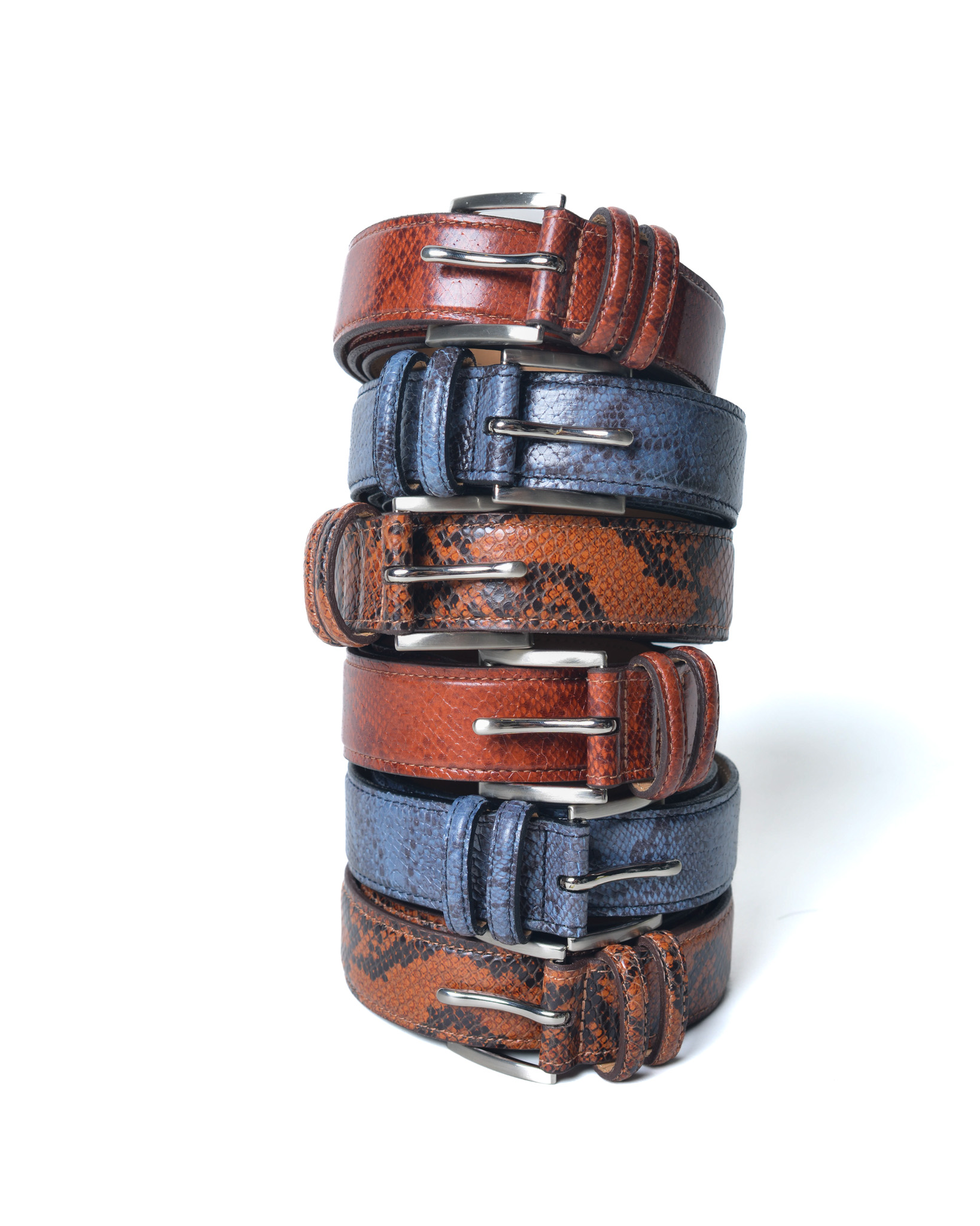 Produzidos em couro bovino legítimo, os cintos Ginga Studios “COBRA” recebem estampas de serpente em 3 cores diferentes, com texturas e personalidades únicas.