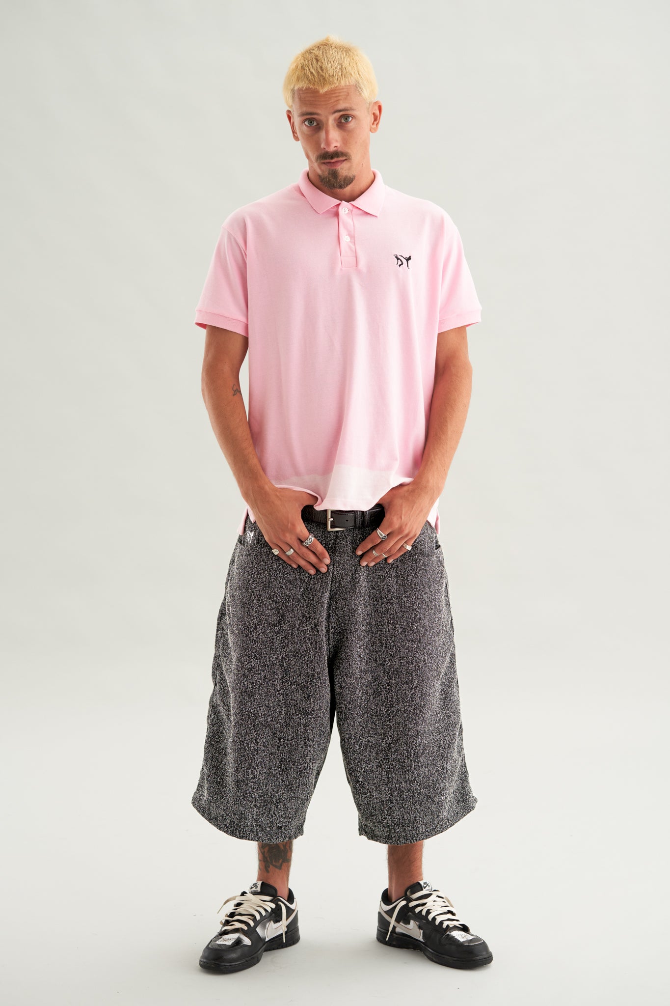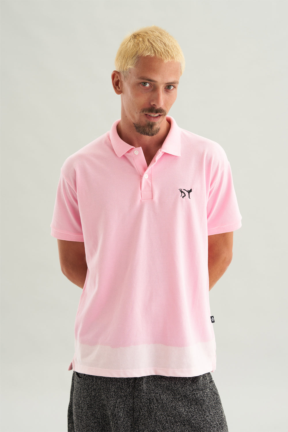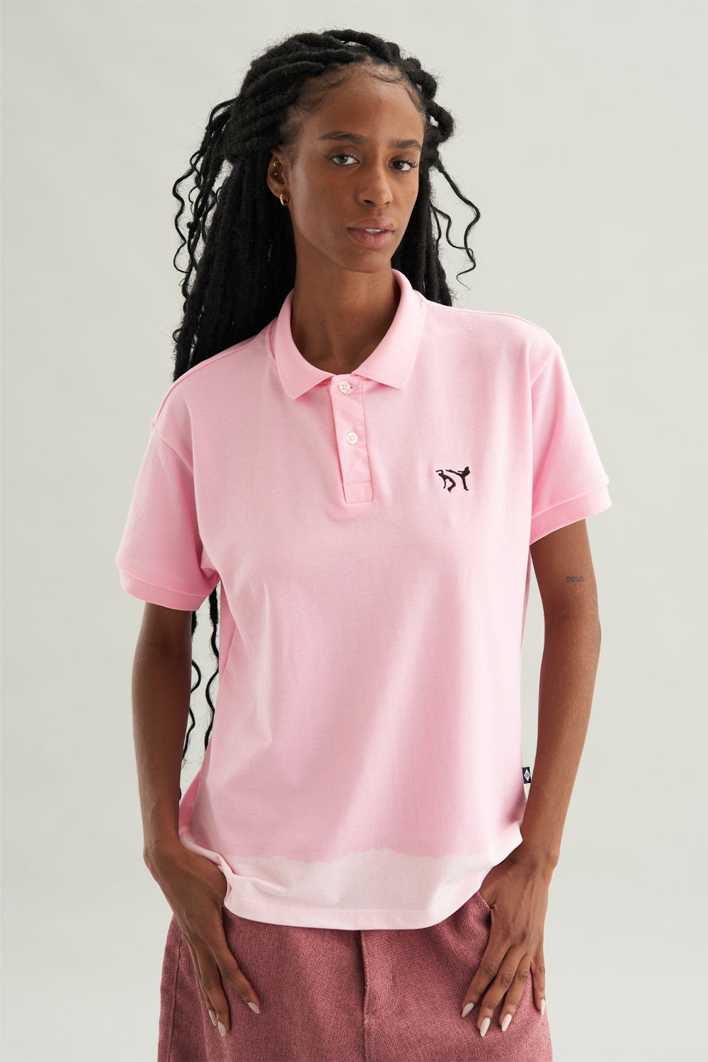 A Polo Risky Pink é uma escolha ousada. Em um tom marcante, a peça ganha ainda mais personalidade com o efeito descolorido artesanal na parte inferior, criando variações únicas em um estilo DIY. O bordado de capoeiristas no peito entra como um toque de assinatura da marca, assim como a etiqueta autoral com a bandeira do Brasil na lateral.