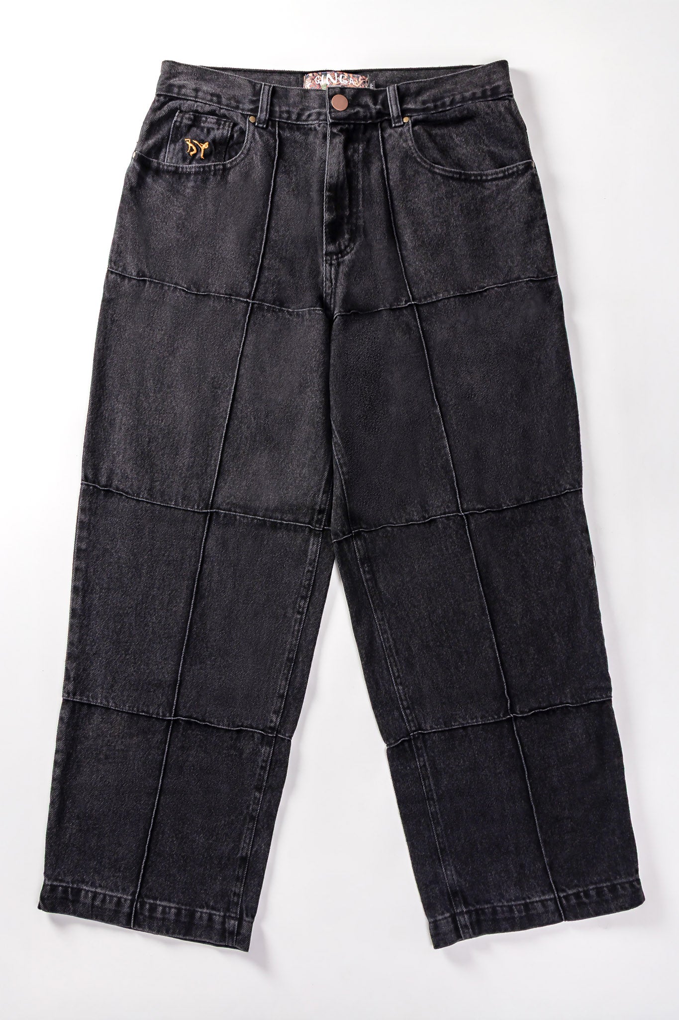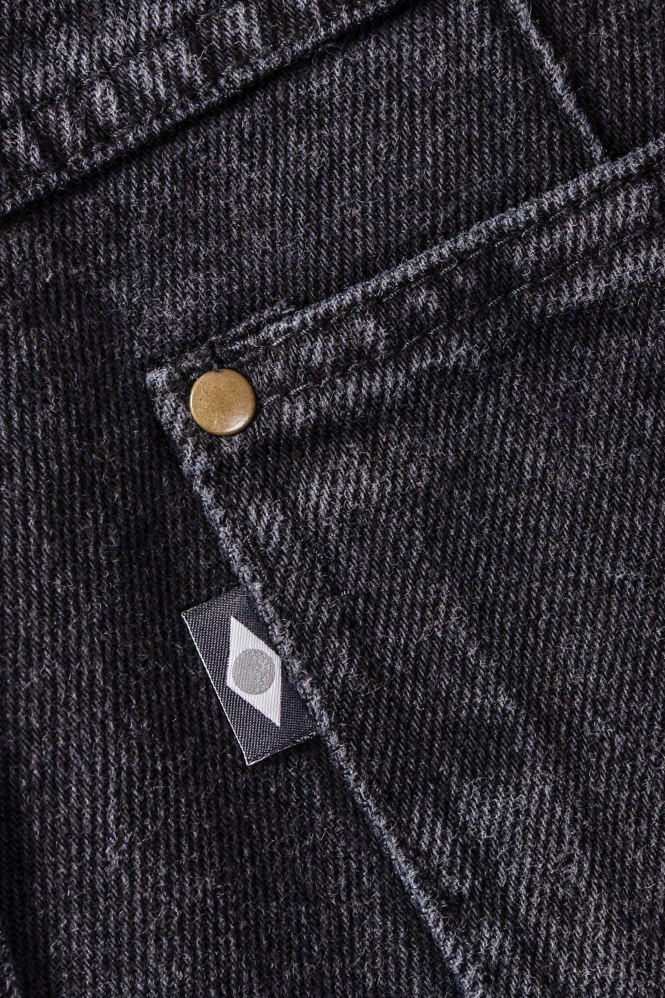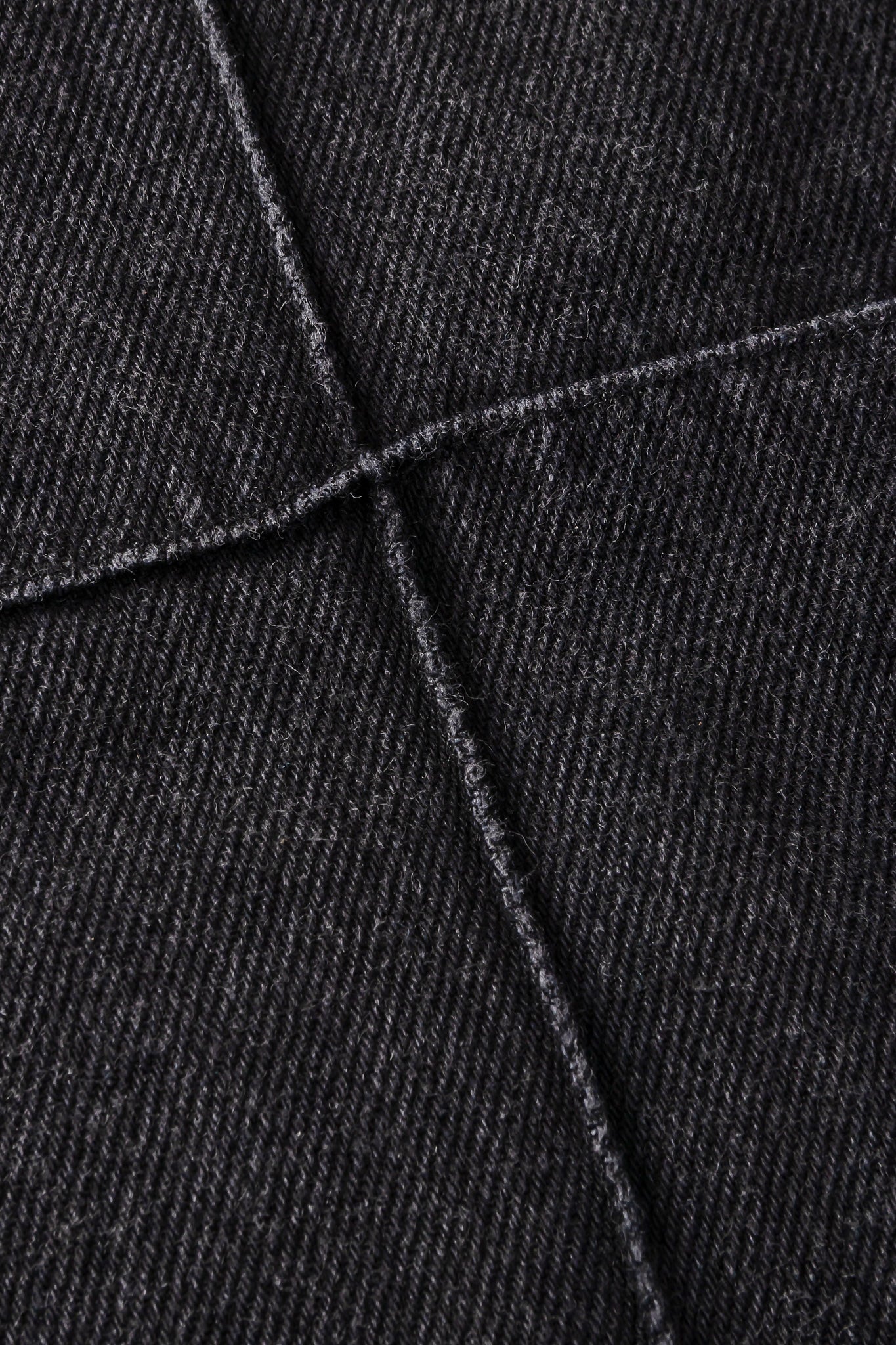 Uma peça cortada em blocos e reconstruída, onde as costuras aparentes formam uma malha geométrica que evoca uma identidade quase arquitetônica. Rebites em latão reforçam a estrutura com precisão técnica, enquanto o patch traseiro desfiado em jacquard acrescenta um gesto de sofisticação e trabalho minucioso. Cru, experimental e tratado como escultura.
