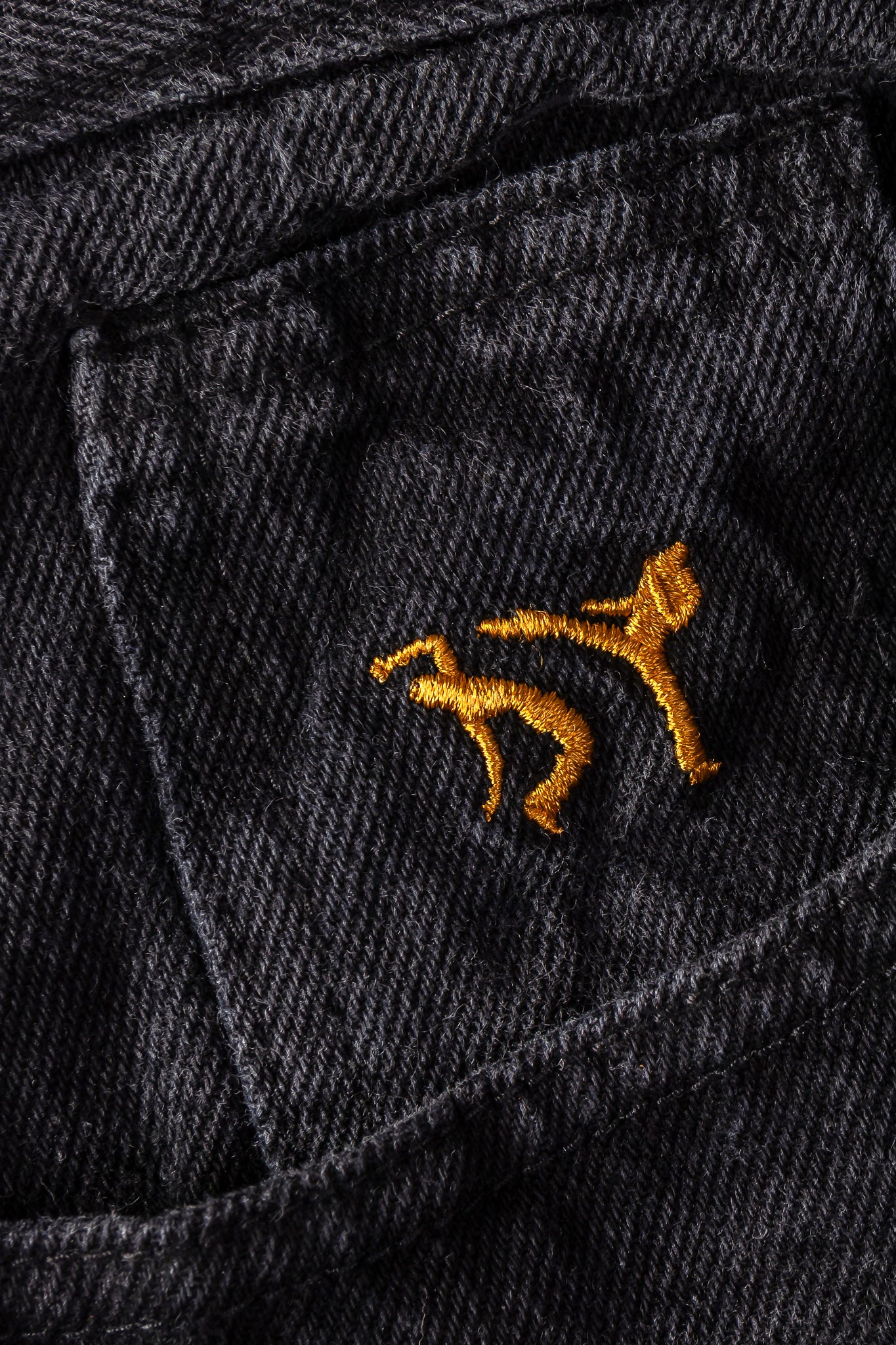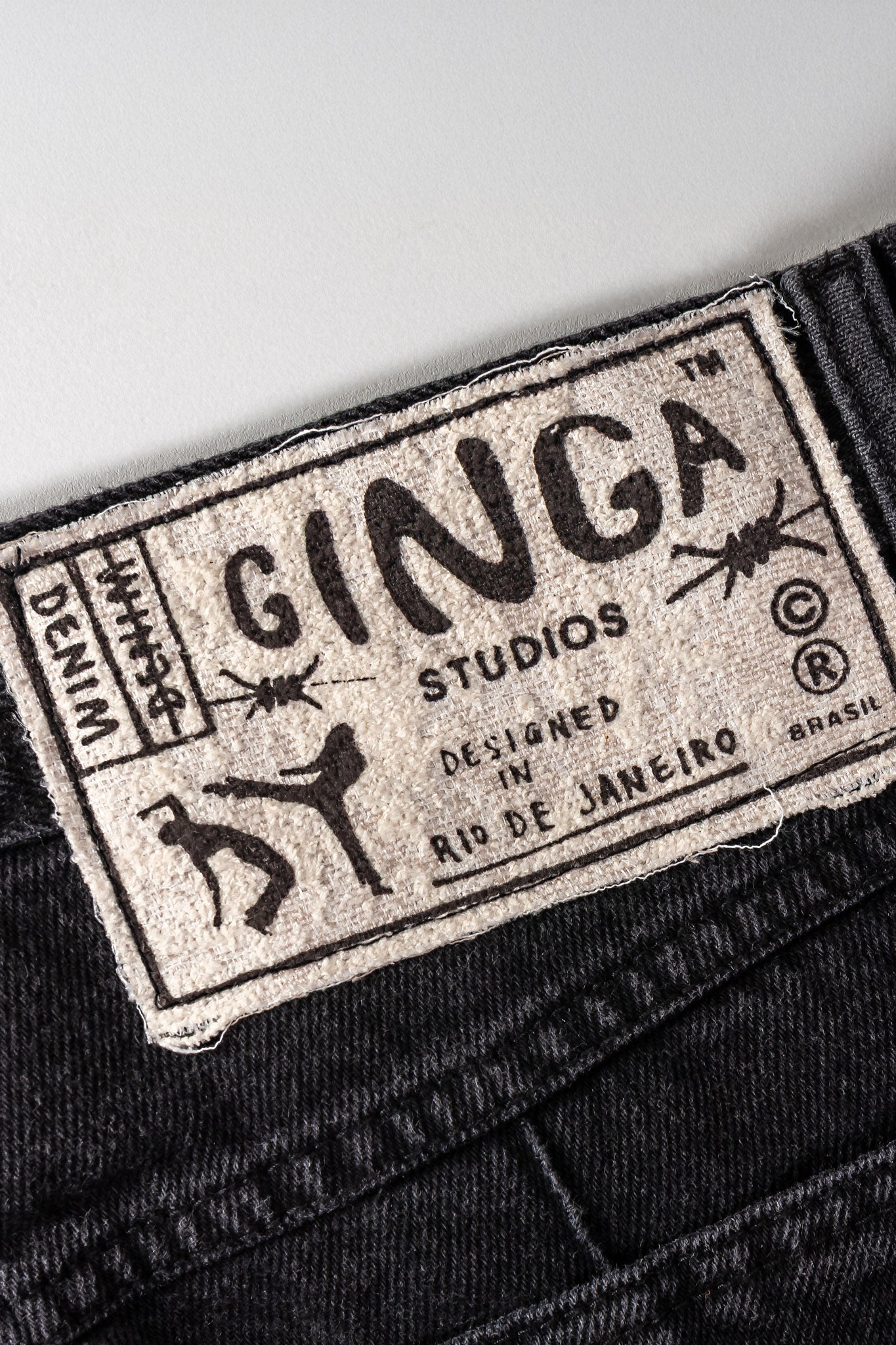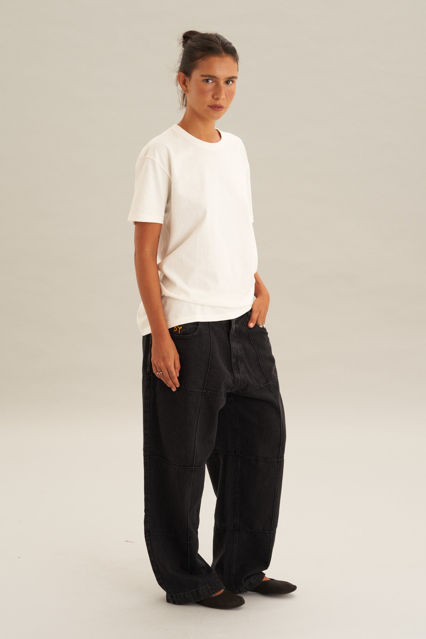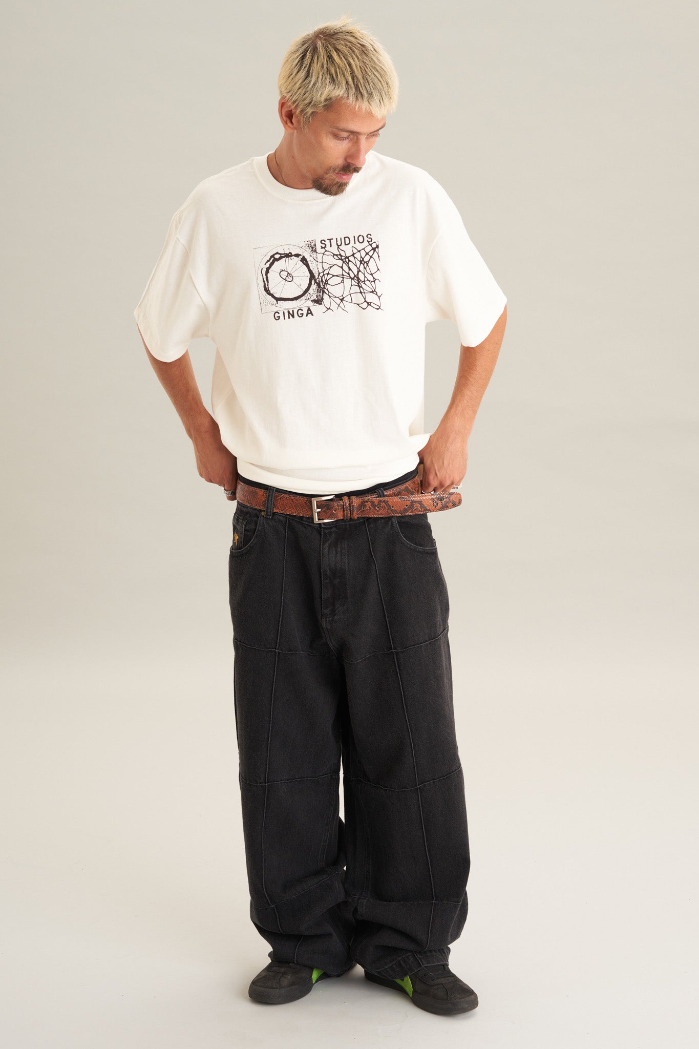 Uma peça cortada em blocos e reconstruída, onde as costuras aparentes formam uma malha geométrica que evoca uma identidade quase arquitetônica. Rebites em latão reforçam a estrutura com precisão técnica, enquanto o patch traseiro desfiado em jacquard acrescenta um gesto de sofisticação e trabalho minucioso. Cru, experimental e tratado como escultura.